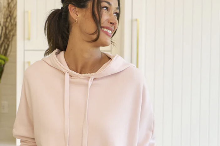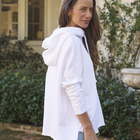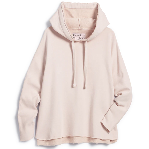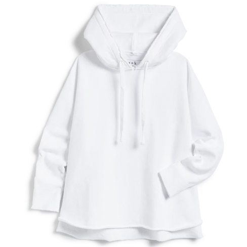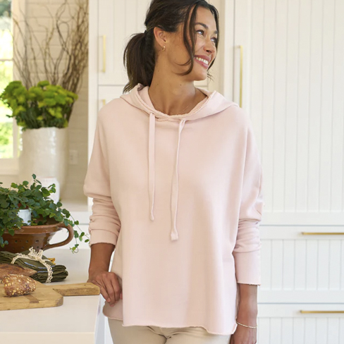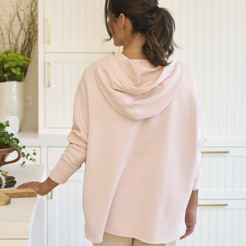 The epitome of elevated leisurewear, the Kane hooded sweat offers a roomy fit and functional hood to create the perfect pullover! // The feminine drape and comfy continuous seam sleeves are so flattering for busy days running to the gym, to brunch, or around the block with your dog // With a hand-cut raw hem & oversized drawstring hood, this wear-on-rotation hoodie is a must! //