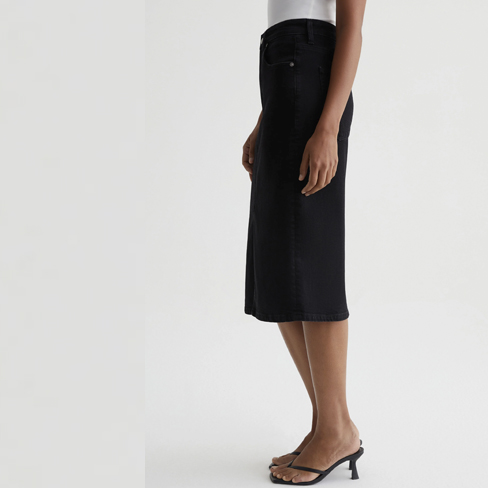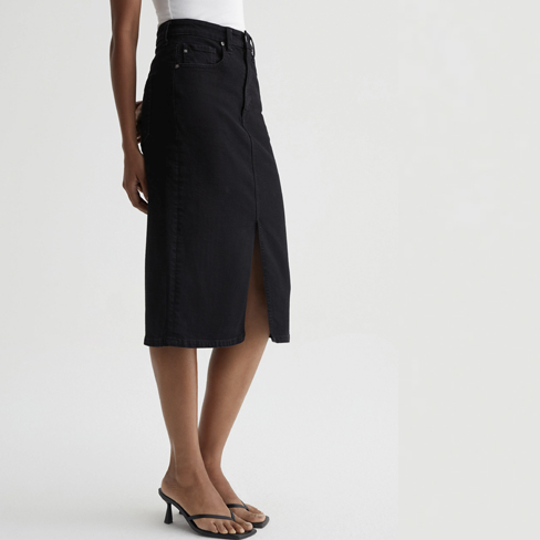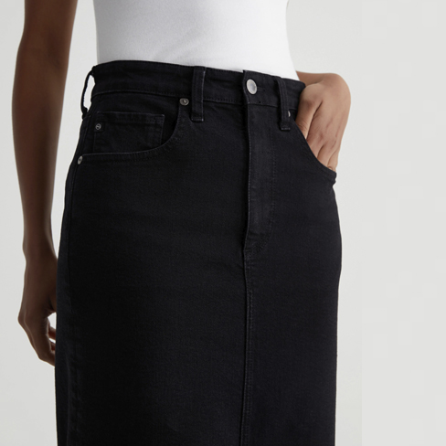 The denim skirt trend is in full force for Autumn 2024 and AG Jeans Tefi denim skirt ticks all the boxes! // Made from a washed black stretch denim, this high-waisted midi skirt has five-pocket styling and falls just below the knee // With a cute front slit, style this shirt up or down with ease; from a slinky silk top, to a cozy knit or a white t-shirt // Stock is limited, RUN, do not walk, it won't be here for long! // Sizes 8-12 //